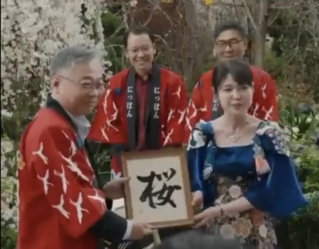 今回のパフォーマンスでは、シンガポールと日本の共創・共働・共進を願い、桜の絵をバックに揮毫いたしました。